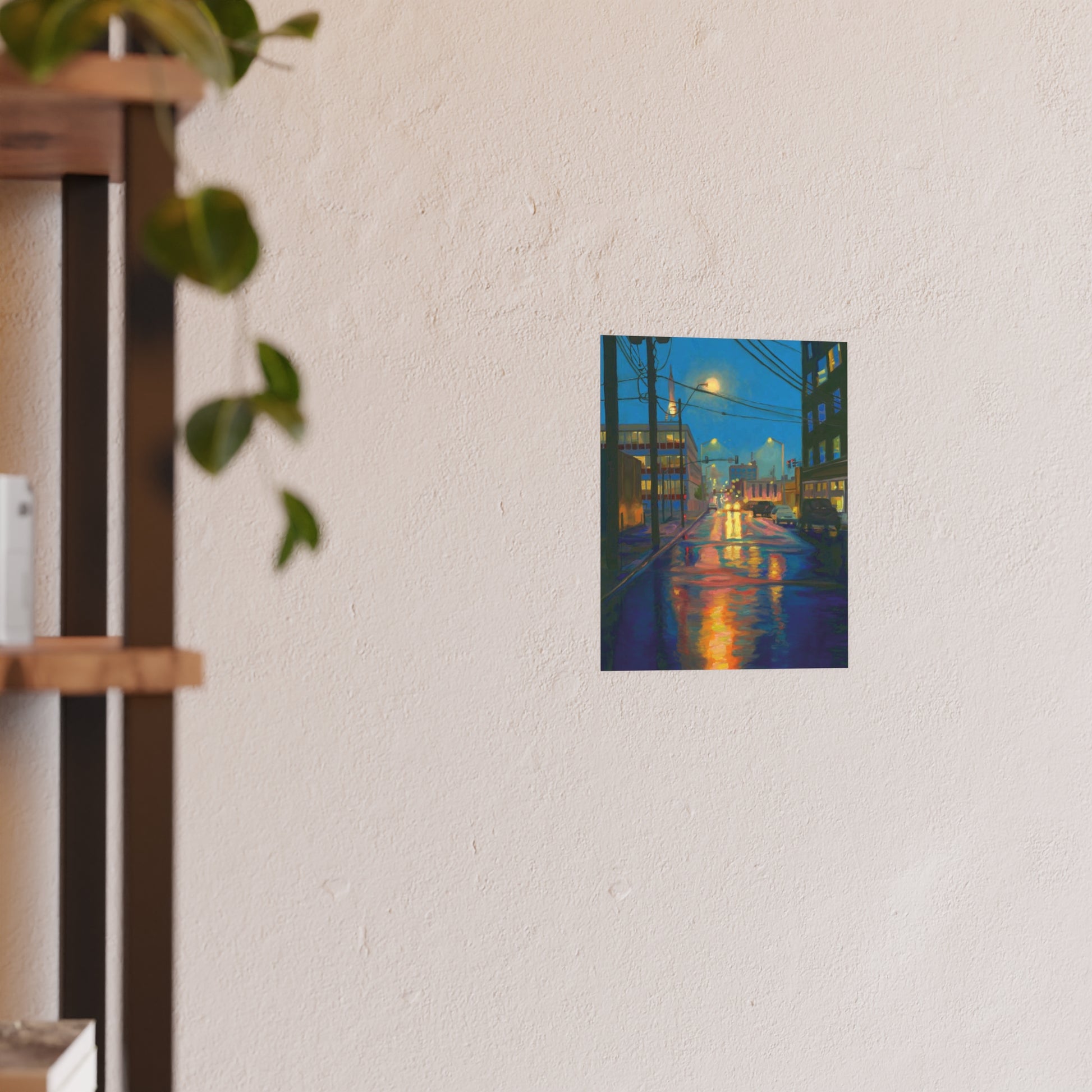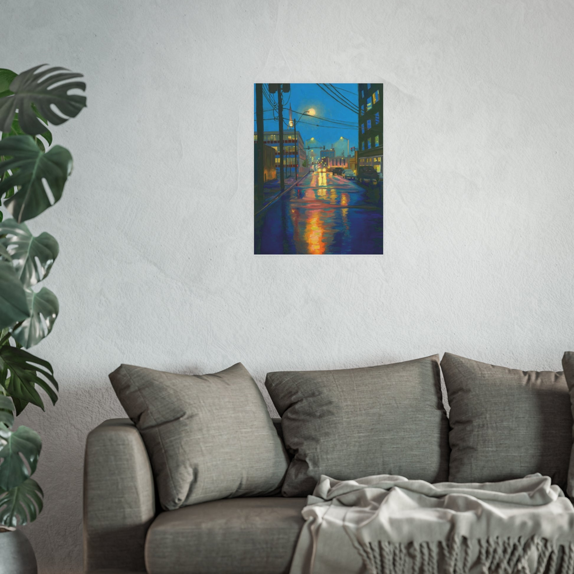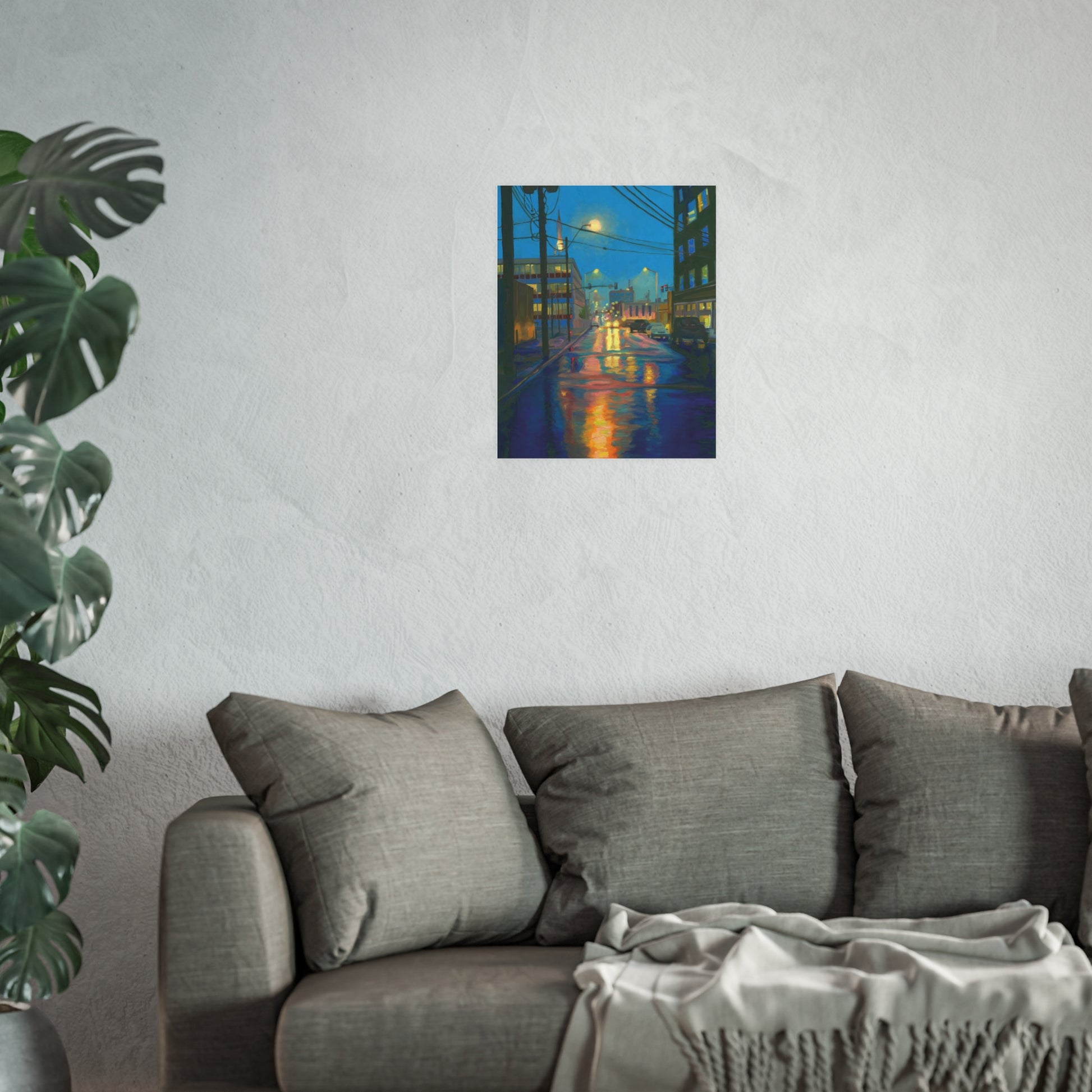 This poster brings Vanessa Lacy’s rain-washed street scene into your space with vivid color and quiet nostalgia. The painting captures 18th and Baltimore—Bauer Building on the right where Lacy once kept a studio, and the space shuttle above the TWA Building—rendered with saturated hues and fine detail that pop whether you choose satin or archival matte paper. Hang it in a living room, studio, or hallway to evoke late-night city strolls, memory-laced architecture, and the gentle hum of urban history. The mood is reflective and cinematic: puddled sidewalks catching neon, landmark silhouettes that anchor a story, and a palette that feels both modern and lovingly preserved. Choose the satin finish for luminous color and smooth sheen, or archival matte for museum-grade depth and a tactile, low-glare surface—each printed in the USA on substantial paper to last on your wall for years. Product features - Bright, accurate color reproduction using modern printing techniques - Choice of satin (210 gsm) or archival matte (230 gsm) paper finishes - Available in 18 sizes with horizontal, vertical, and square formats - Printed and assembled in the USA from globally sourced materials - Heavy-weight paper for durable, gallery-quality display Care instructions - If the poster does gather any dust, you may wipe it off gently with a clean, dry cloth.