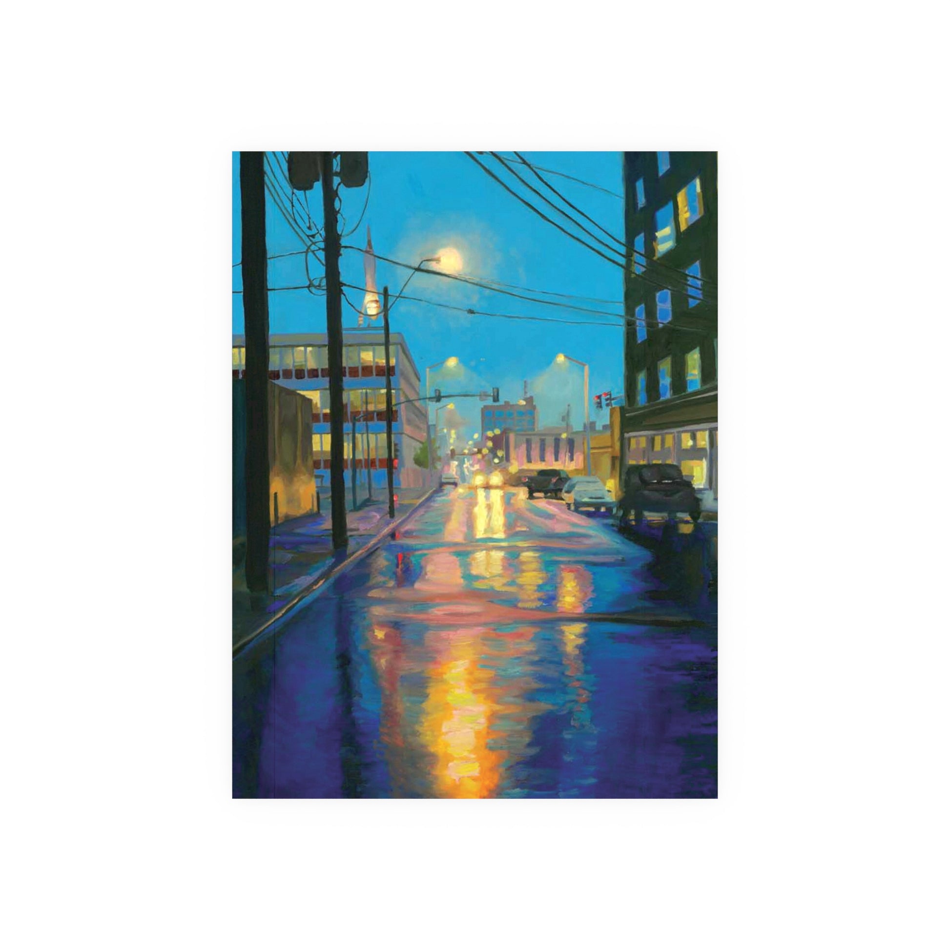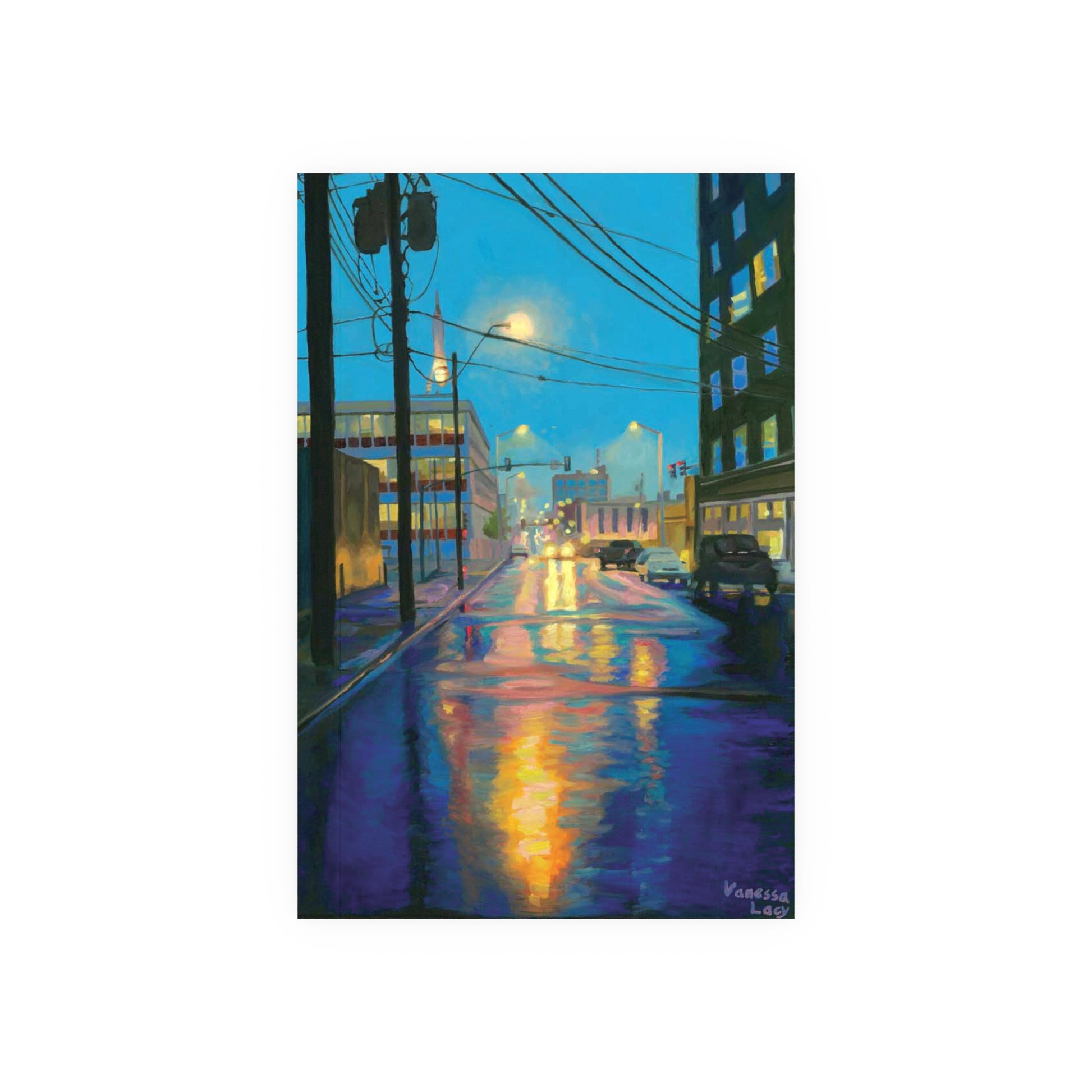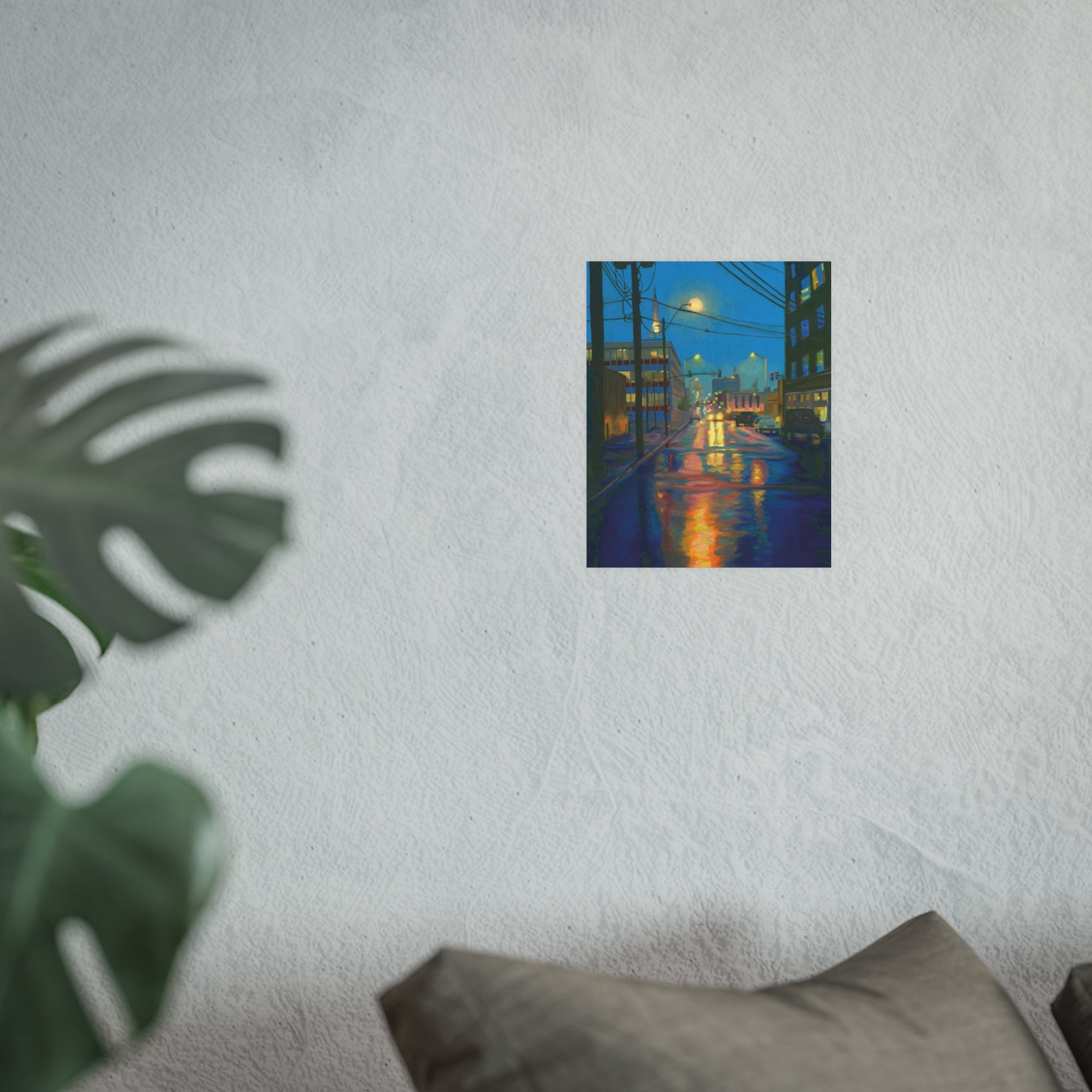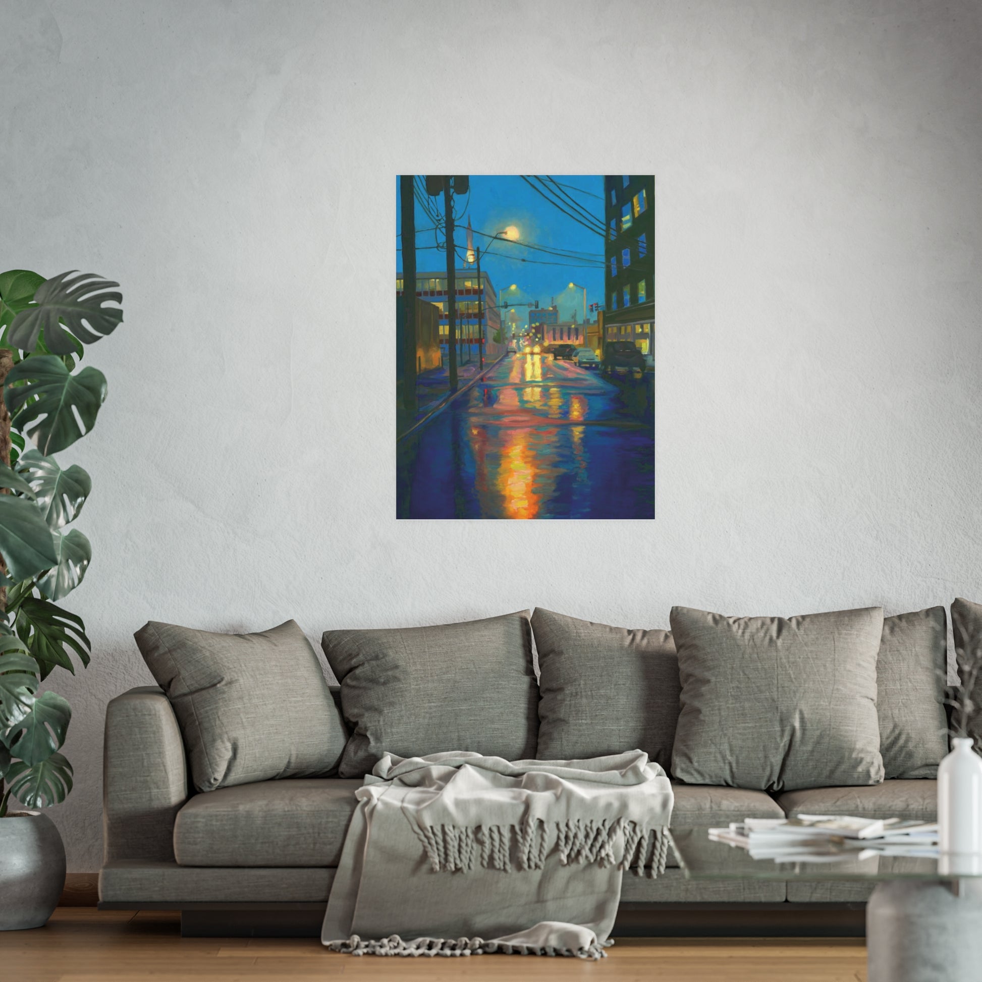 This poster brings Vanessa Lacy’s rain-washed street scene into your space with vivid color and quiet nostalgia. The painting captures 18th and Baltimore—Bauer Building on the right where Lacy once kept a studio, and the space shuttle above the TWA Building—rendered with saturated hues and fine detail that pop whether you choose satin or archival matte paper. Hang it in a living room, studio, or hallway to evoke late-night city strolls, memory-laced architecture, and the gentle hum of urban history. The mood is reflective and cinematic: puddled sidewalks catching neon, landmark silhouettes that anchor a story, and a palette that feels both modern and lovingly preserved. Choose the satin finish for luminous color and smooth sheen, or archival matte for museum-grade depth and a tactile, low-glare surface—each printed in the USA on substantial paper to last on your wall for years. Product features - Bright, accurate color reproduction using modern printing techniques - Choice of satin (210 gsm) or archival matte (230 gsm) paper finishes - Available in 18 sizes with horizontal, vertical, and square formats - Printed and assembled in the USA from globally sourced materials - Heavy-weight paper for durable, gallery-quality display Care instructions - If the poster does gather any dust, you may wipe it off gently with a clean, dry cloth.
