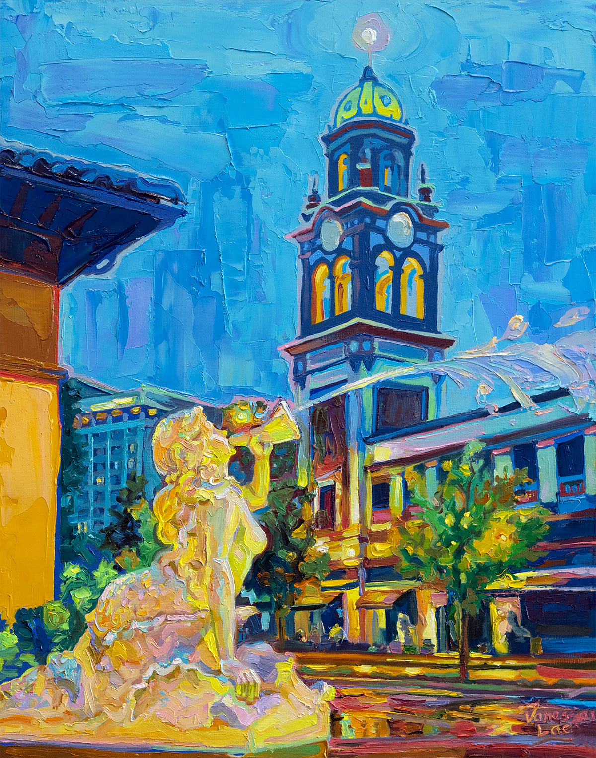 Original oil painting on deep-sided wood panel. This painting depicts the mermaid fountain and iconic architecture of the Kansas City Country Club Plaza. Vanessa Lacy captures the soothing nocturnal scene as is glows with shiny wet streets and city lights.
