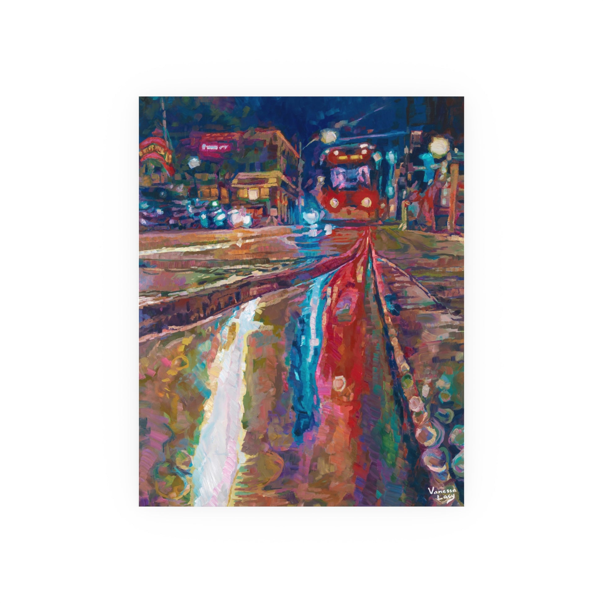 This poster features a print of a painting by Kansas City artist Vanessa Lacy titled 'Wet Streetcar Rails in City Market.' It depicts Kansas City's Rivermarket with the streetcar going through on a rainy night, giving a nostalgic and urban vibe. Perfect for art enthusiasts, Kansas City locals, and those who appreciate cityscapes. Ideal for home decor, offices, or gifts for lovers of Kansas City and urban art. Relevant for home decoration, art appreciation, and gift giving.